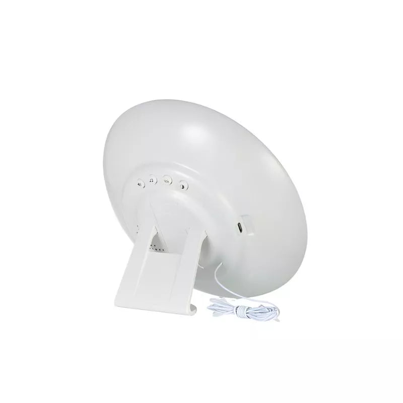 Acest ceas simuleaza rasaritul si apusul soarelui pentru a te ajuta sa te trezesti si sa adormi mai usor. Lumina se intensifica treptat cu 30 de minute inainte de ora setata pentru alarma, imitand rasaritul. La culcare, lumina scade treptat, imitand apusul. Dispozitivul este echipat cu 7 sunete din natura, radio FM, afisaj LED si functie de amanare (snooze).