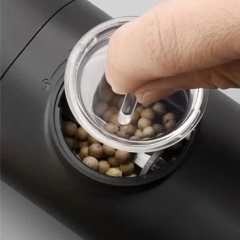 This set includes 2 stylish electric grinders, perfect for salt and pepper. Each grinder features a transparent container, power button, coarseness adjustment ring, and a storage base.