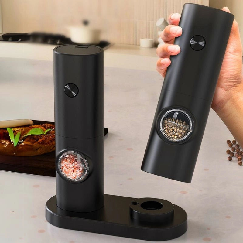 Zestaw zawiera 2 nowoczesne mlynki elektryczne idealne do soli i pieprzu. Kazdy mlynek posiada przezroczysty pojemnik, przycisk uruchamiania, pokretlo do regulacji grubosci mielenia i baze do przechowywania.